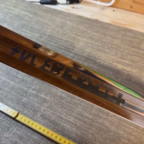 Trysil-Knut langrennsski med feste og bindinger. Skiene har en tradisjonell design med blå og gull detaljer. Siste modell treski som ble laget ca 1978