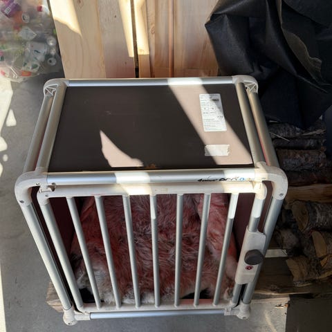 Metallbur med sort plastbunn. Designet for bruk til kjæledyr. Bur med enkelt døråpning og sammenleggbart rammeverk.