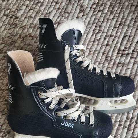 Stadion Ishockeyskøyter for barn i størrelse 35. Skøytene er designet for ishockey og har svart farge med hvite detaljer. Slitt på tuppen, men mye moro / bruk igjen.