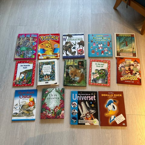 Et utvalg av bøker inkludert barnebøker, ungdomsbøker og romaner i ulike størrelser og titler. Bøkene dekker ulike sjangre og temaer, med variasjon i farger og omslagsdesign. Det er både norsk og engelsk litteratur i kassen.
