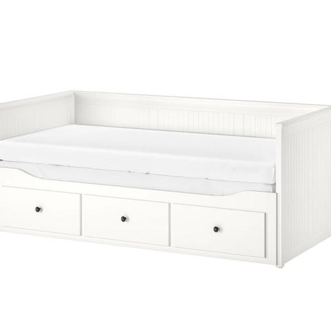 Selger to stk pent brukte IKEA Hemnes dagsenger. Praktisk seng med 3 store oppbevaringsskuffer. Kan brukes som både sofa og seng. Sengebunn kan trekkes ut til dobbeltseng. Sengen er hvit og laget av tremateriale. Knotter på skuffer er byttet ut til lærreimer på den ene senga (se bilde).