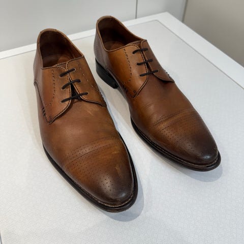 Skoene er pent brukt og godt tatt vare på. Normal slitasje på såle og noe bruksspor i skinnet, men fortsatt mye bruk igjen. Ingen skader.