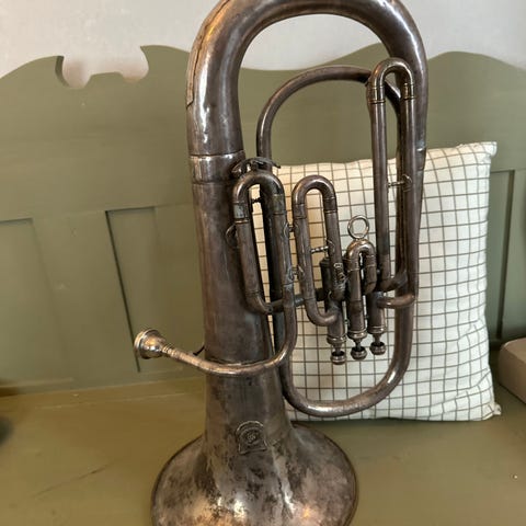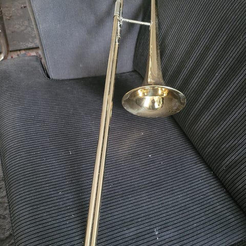 Trombone med tilhørende koffert for trygg oppbevaring og transport. Fin nybegynnertrombone (tenor?).