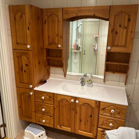 Baderomsinnredning med integrert vask, speil og skap under vasken. Inkluderer oppbevaringsskap på begge sider av speilet. 120cm. Må hentast snarast.