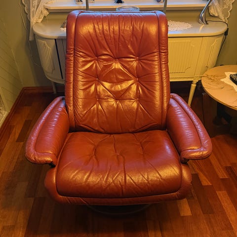 To pent brukte lenestoler i skinn med noe slitasje. Stolene har vippefunksjon og skammel som kommer ut i liggestilling.