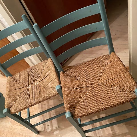 Stolene er faste i setet og ledd. Kun mindre merker i treverk.