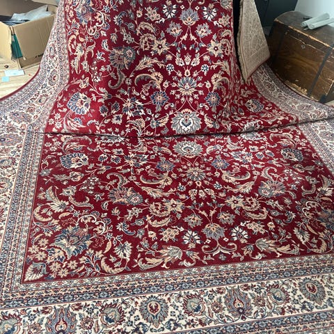 Selger et pent brukt flossteppe på 2x3 meter. Ligger delvis under en skjenk, så noen merker etter det som blir borte ved å rufse litt i teppet. Noen tråder har blitt dratt ut, men dette kan bare klippes til, så vil det antagelig ikke være synlig. Og mulig litt støv, men man kan bare dra over med en fuktet klut. Aldri vært sølt noe på teppet, så i god stand. Varm fin vinrødlig farge. Ligger stødig på gulvet.