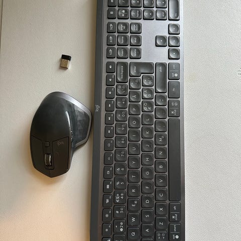 Selger Logitech tastatur (MX Keys) sammen med trådløs Logitech-mus.