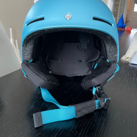 Sølvfarget protec hjelm strl L, ca 58 cm. Mangler strikken bak til å holde briller på plass. Ellers hel og pen.