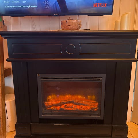 Elektrisk peisovn i svart farge med kontrollpanel for innstillinger. Designet for elektrisk oppvarming med realistisk flammeeffekt. Passer til innendørs bruk for å skape stemning og ekstra varme.