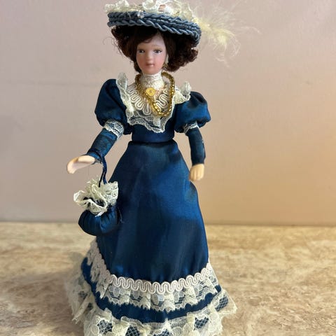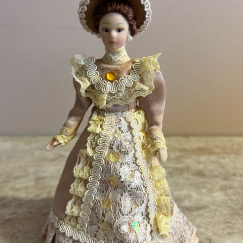 Dukke med vintage kjole i brun og beige. Kjolen har detaljer i blonder og blomster, samt en hatt med dekor. Passer til dukkehus skala 1:12
