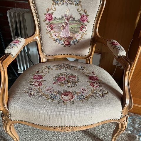 Pent bevart eldre lenestol i klassisk stil, trolig fra tidlig 1900-tall. Solid treverk med fine utskjæringer og originalt vevd/blomstret stoff. Stabil og god å sitte i, kun normal aldersslitasje. Passer perfekt som dekorstol, lesestol eller i klassisk interiør.