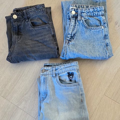 Selger 3 stk LMTD jeans kjøpt på Kids Brand Store. Modellen er litt «baggy». En svart, en grå og en lys blå. Den lyse blå har et bittelite hull på det ene kneet, men ikke av betydning.