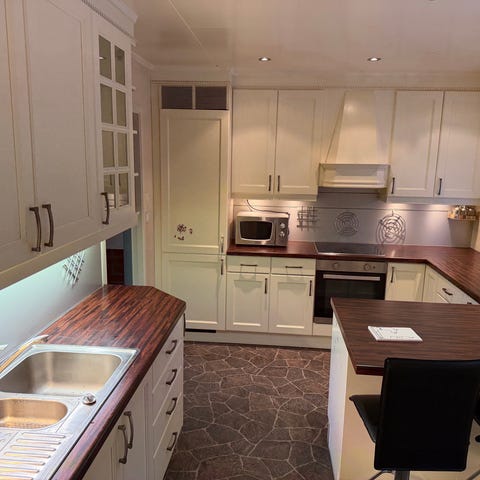 Pen kjøkkeninnredning i tre med benkeplate, inkludert oppvaskmaskin, koketopp, mikrobølgeovn og stekeovn. Kvalitetskjøkken fra Marbodal. Det er fra tidlig 2000-tall, men hvitevarene er nyere. Alt fungerer som det skal. Nyere Røroshetta ventilator. Innredningen er 282 cm (venstre) x 303 cm (høyre) x 220 cm (høyde). Må hentes og demonteres raskt, innen 4. februar. Prisen er satt kun for å dekke kostnaden for å få rørlegger til å koble fra.