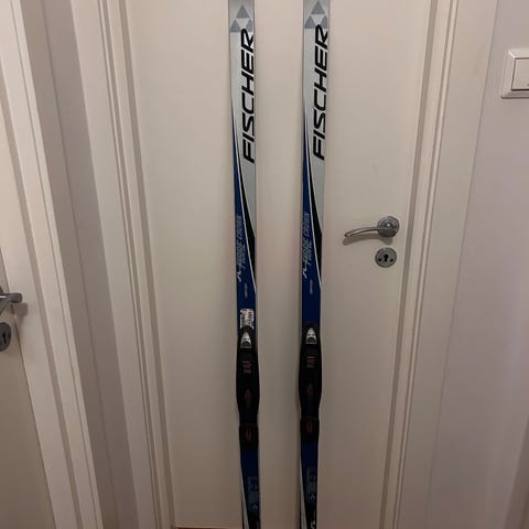 Fischer RCS langrennsski med bindinger. Skiene har en svart farge og er designet for klassisk stil. Egnet for bruk på preparerte skiløyper.