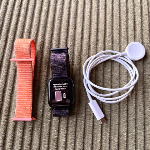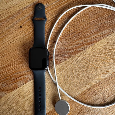 Apple Watch Series 3 smartklokke med svart reim. Enheten har en firkantet skjerm og magnetisk lader inkludert. Passer for daglig bruk med funksjoner for helseovervåkning og tilkobling til iPhone.