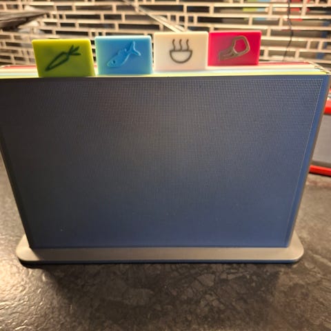 4 stk skjærebrett i plast til diverse matlaging. Kommer i en holder, fra Joseph&Joseph på kitchn. Er brukt, men kan fint brukes lenger. Noen flekker på utsiden som man kan skrubbe enda mer på :)