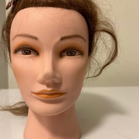 Pent brukt øvingshode med langt hår du kan føne,slette og krølle. Ikke vært klippt av meg, står noen tuster opp oppå som visst på bilde men slik har den vært siden den va ny.
