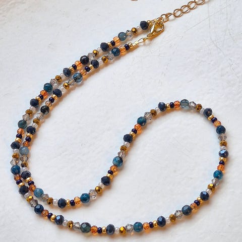 Blå/hvite perler med sjatteringer er av agat (str. 4 mm), resten er ulike glassperler. Størrelsen på perlene er ca. 2-4 mm. Perler og smykkelåser av god kvalitet. Låsen er gullforgylt. Blå, turkis og hvite nyanser.