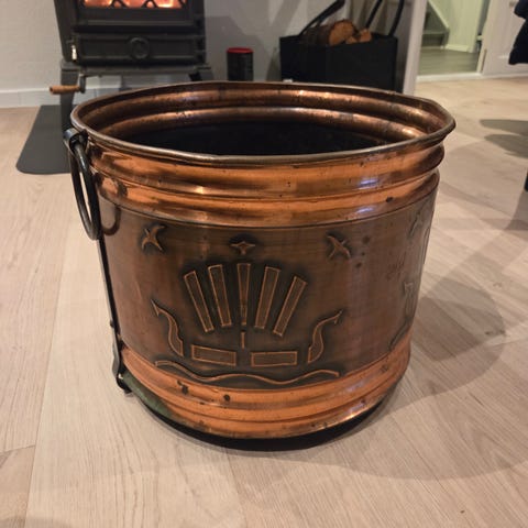 Gammelt Trespann laget av tre med to håndtak. Spannet har en sirkulær form og er åpent i toppen. Passer til oppbevaring eller dekorative formål.