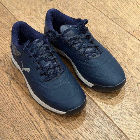Puma Golf sko i størrelse 43, med hvit og svart farge. Skoene har en kombinasjon av materialer egnet for golfbruk, med gummisåle som gir godt grep.
