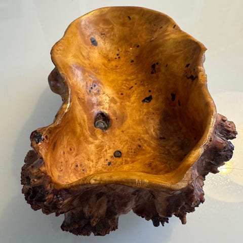 Treplate i naturlig form med ujevn kant og synlige årer. Platen har en varm brunfarge og en ubehandlet overflate som fremhever treets naturlige tekstur og mønster. Passer til dekorative formål eller som serveringsfat.