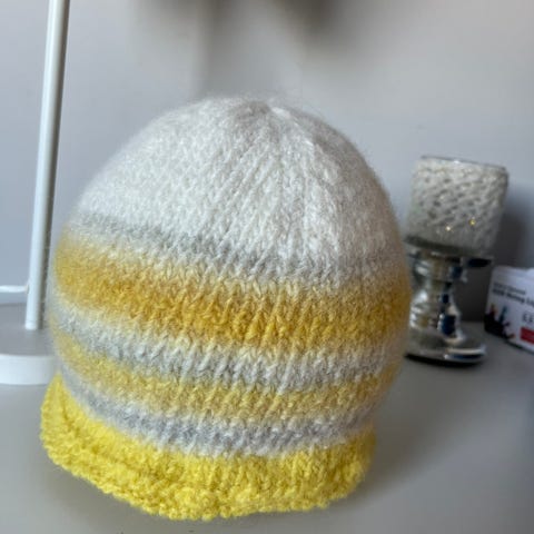 Håndstrikket og tovet badstue lue i rød, hvit og blå. Strikket i Viking Eco Highland 100% ullgarn, selges fordi fargene var "feil". Ikke brukt. Kun prøvet på.