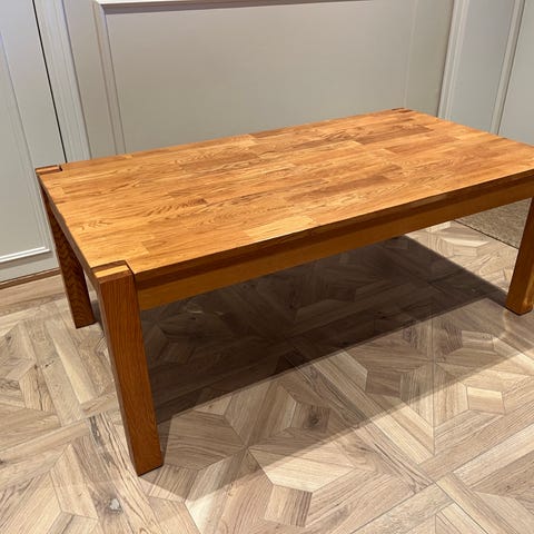 Salongbord heltre eik. Fint bord uten skader, men vil ha godt av å vaskes godt ned. Evt lett puss og oljes. Må hentes.