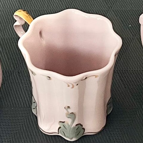 4 kopper og 4 fat, og en lysestake. Alle har forskjellig mønster. Det er avsatt plass på fatet til koppene.