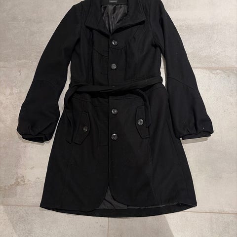 Zara Basic kåpe i svart farge, størrelse XS, laget av bomull. Kåpen har dobbelspent front med belte i livet og mansjetter med spenne. Designet for kvinner.