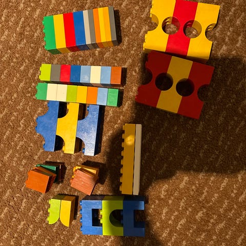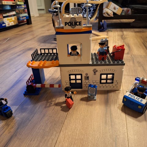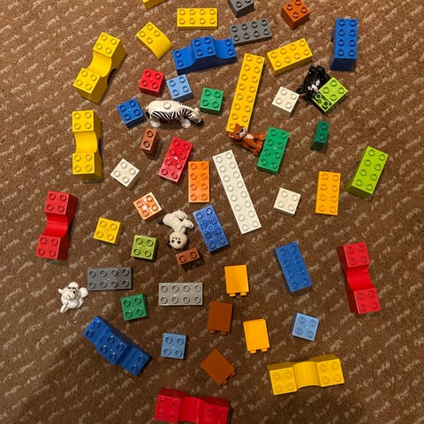 LEGO DUPLO byggeklosser og figurer i ulike farger og former. Inkluderer kjøretøy, dyrefigurer og mennesker. Passer for små barn og bidrar til utvikling av motorikk og kreativ lek.