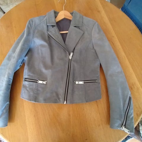 Grå linjakke fra Nygårdsanna i str M. Innsvinget og figurnær passform. Brystvidde 2x45 cm, lengde bak 46 cm. Jakka lukkes med hekter, har forseggjorte sømdetaljer, og feminint snitt. Sender gjerne, kjøper betaler porto.