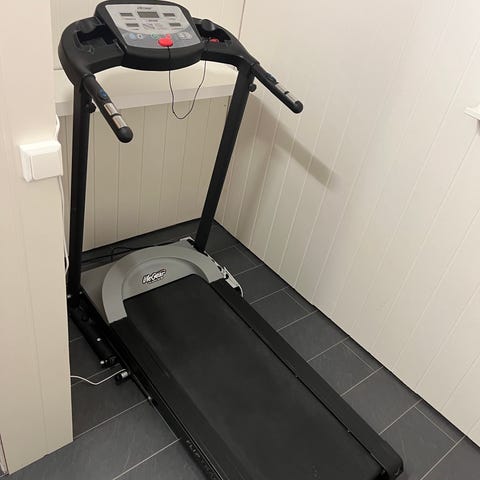 Tredemølle i svart farge med digitalt display som viser hastighet og andre treningsdata. Egnet for innendørs bruk og trening.