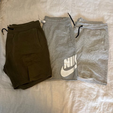 3 shortser (Nike shortsen er XL med snøring i livet), 3 treningsbukser (buksa på siste bildet er medium), 1 Nike treningsgenser. Alt for 500kr.