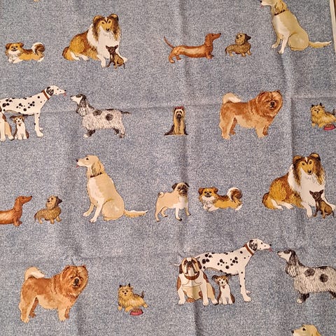 Stoff med 4 dyremotiv . Pr rute er ca 21 cm x 26 cm