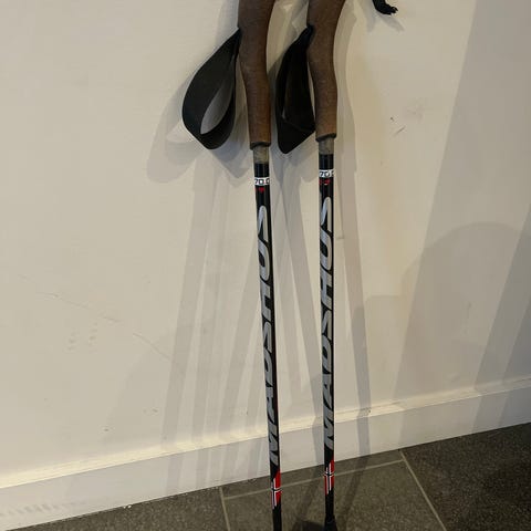 Madshus langrennstaver med lengde 130 cm. Korkhåndtak og grep i str small.