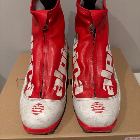 Alpina Race skisko i fargene rød og hvit. Skiskoene har glidelås foran for enkel på- og avkledning. Designet for bruk i langrennsski.