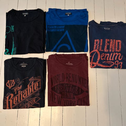 2 bukser, en Tommy Hilfiger T-skjorte, en collage genser selges samlet for 350kr.