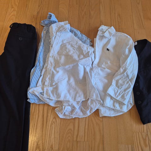 Hvit skjorte og mørkegrå vest + bukse i str 116. Alt fra Kappahl.