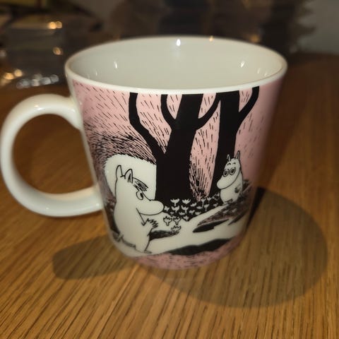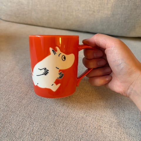 Helt nydelig, unik og fargesterk gul Yamaka Mummitrollet-kopp fra Japan. Inkludert vakker gravert treboks!!