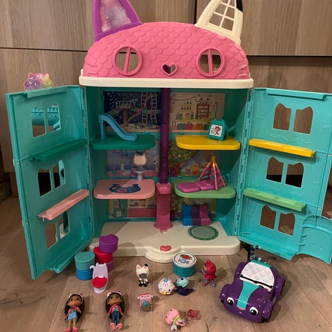 Selger Gabbys Dukkehus med figurer/ deler som vises på bildene.