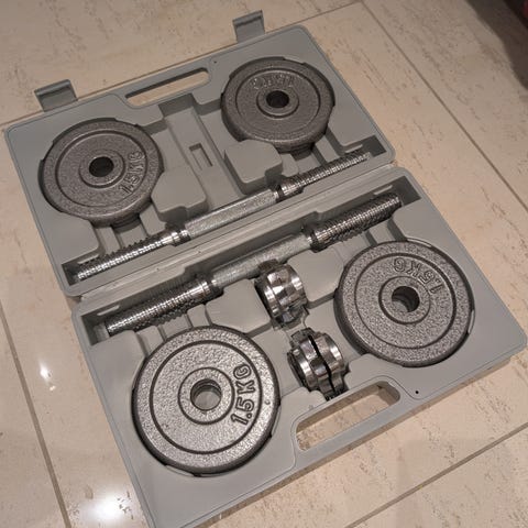 Jeg selger 15kg Chrome dumbell set og 4 vektskiver som veier 2,5kg hver.