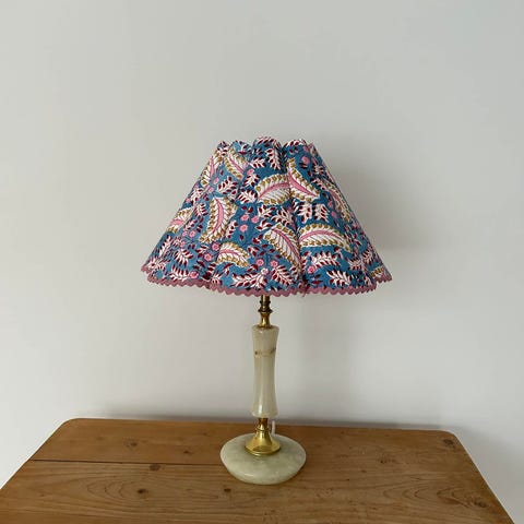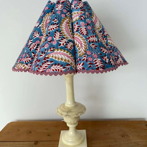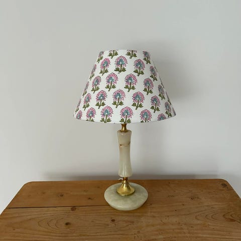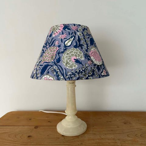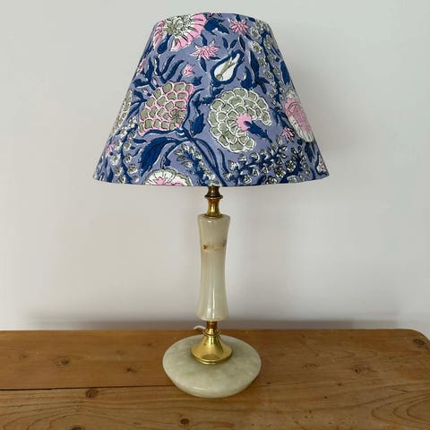 Liten søt onyxlampe med håndlaget skjerm i stoff fra Studio Bazar Høyde 18 cm opp til sokkel 34 cm til toppen av skjermen