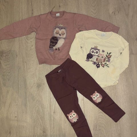 Lindex barneklær sett i lilla farge, størrelse 98, designet for jenter. Sett består av overdel og bukse med mønsterdetaljer.