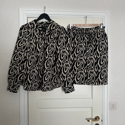 Lekkert hvitt sett i smalstripet cord fra AneMone i str 38. Blusen har rund hals og en litt puff på ermet. Skjørtet har kledelig volang. Kan brukes sammen eller hver for seg. Mykt stretchmateriale og behagelig å bruke. Hver del selges for 300 kr, settet selges for 580 kr.