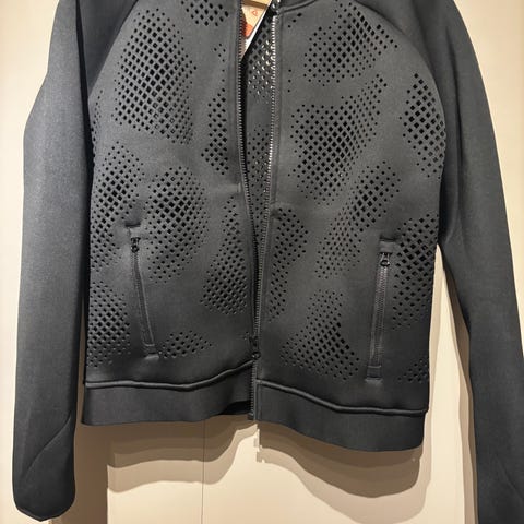 Svart cropped bomberjakke med hel glidelås og to glidelåslommer foran. Stretchstoff med nettinginnsatser. Blanding av nylon/polyester/spandex. God stand.