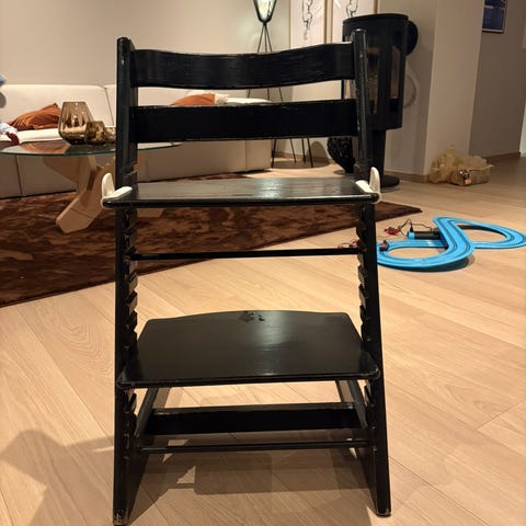 En eldre modell av Stokke tripp trapp stol selges for 500,-. Stolen har justerbare setehøyder og fotstøtte, designet for barn. Den naturlige trefargen gir et enkelt og funksjonelt utseende. Stolen har bruksmerker.