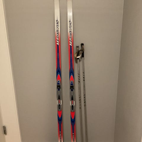 Madshus Nano Sonic Classic Junior Race langrennski med Rottefella bindinger og tilhørende Madshus staver. Skiene har en lengde på 175 cm og stavene er 125 cm lange. Ski og staver er i hvit og rød farge.