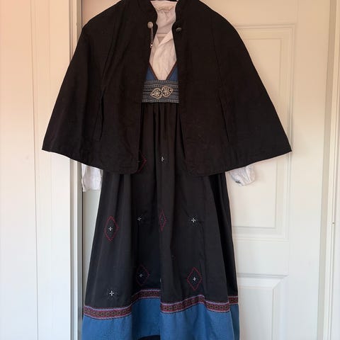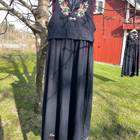 Nameit Festdrakt/Bunad i størrelse 164.. Kjolen er svart og broderte med blomsterdetaljer og kommer med en matchende veske, cape og bunadsskjorte. Brukt 1 gang.