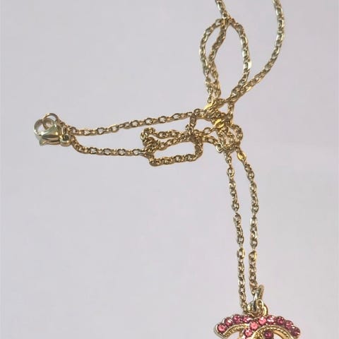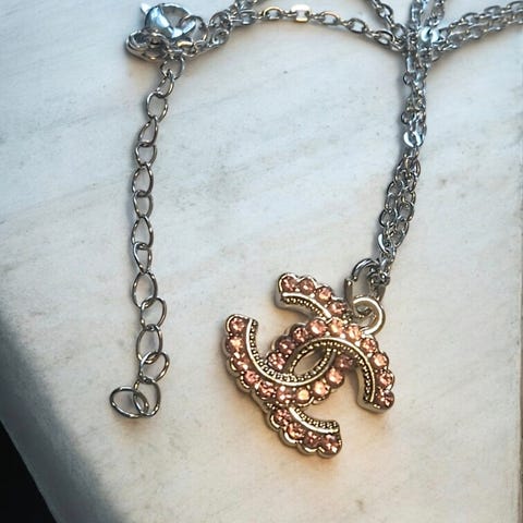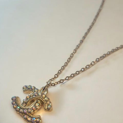 Et nydelig svart Glitrende monogram Halskjede, anheng originalt fra Chanel, re-designet og satt på et 18k gullbelagt rustfritt stål allergivennlig hals smykke på 45cm lengde. Pent å se på.